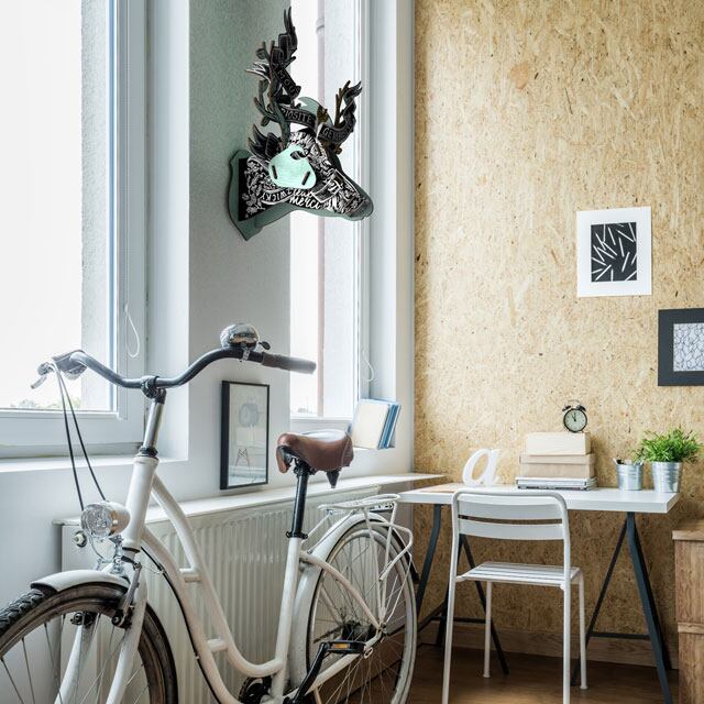 MDF板を組み立ててつくる鹿の壁掛けオブジェです。本格派のMサイズ♪ネジやフックで壁に掛けるのはもちろん、置物として飾ることも可能です。