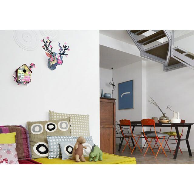 MDF板を組み立ててつくる壁掛けオブジェです。テキスタイル調のカラフルなデザインが、お部屋を鮮やかに彩ります。
