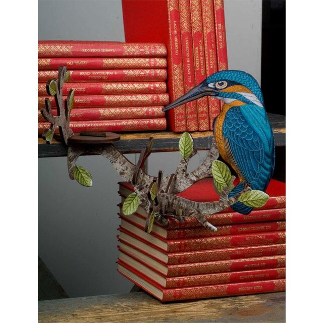 MDF板を組み立ててつくる鳥の壁掛けオブジェです。パーツを取り換えると、本棚にはさんで飾ることもできます。鳥の部分は光沢感のある布製で、シックな雰囲気を演出します。