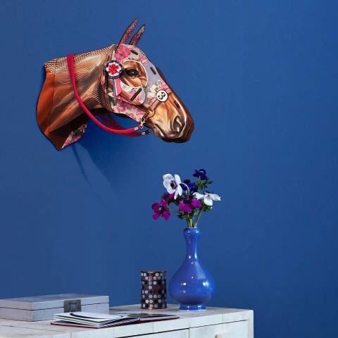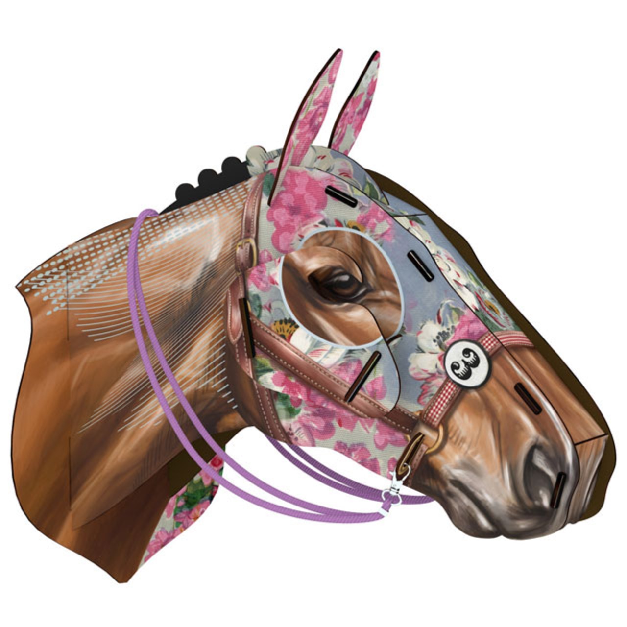 MDF板を組み立ててつくる馬の壁掛けオブジェです。カラフルなテキスタイル風デザインのメンコが馬の魅力を引き立てています。馬のオブジェは、壁に対して頭部が直角ではなく、斜めになるようにデザインされています。また、壁掛け用の穴は上下2ヶ所あり、しっかりと固定することができます。