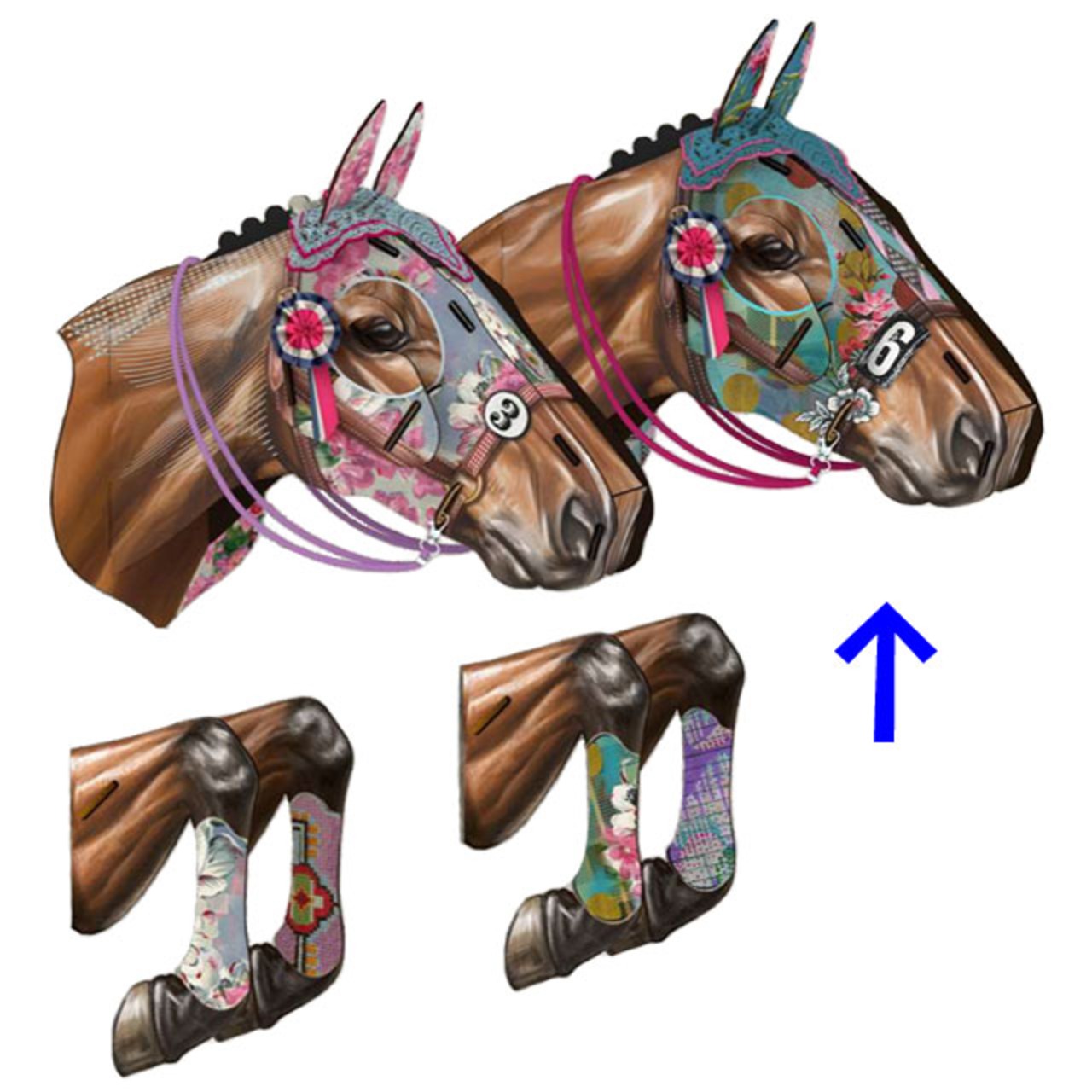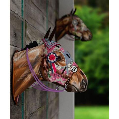 MDF板を組み立ててつくる馬の壁掛けオブジェです。カラフルなテキスタイル風デザインのメンコが馬の魅力を引き立てています。馬のオブジェは、壁に対して頭部が直角ではなく、斜めになるようにデザインされています。また、壁掛け用の穴は頭部に上下2ヶ所あり、しっかりと固定することができます。脚には固定用の穴はなく、付属のプラスチックパーツ(透明)で頭部からぶら下げる形になります。