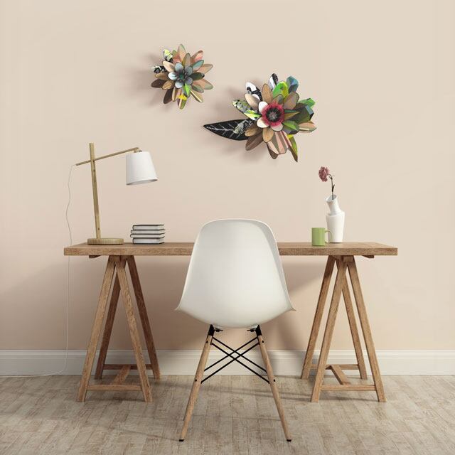 MDF板を組み立ててつくる花の壁掛けオブジェです。カラフルでポップながらも、ナチュラルさを残した素敵なデザインになっています。