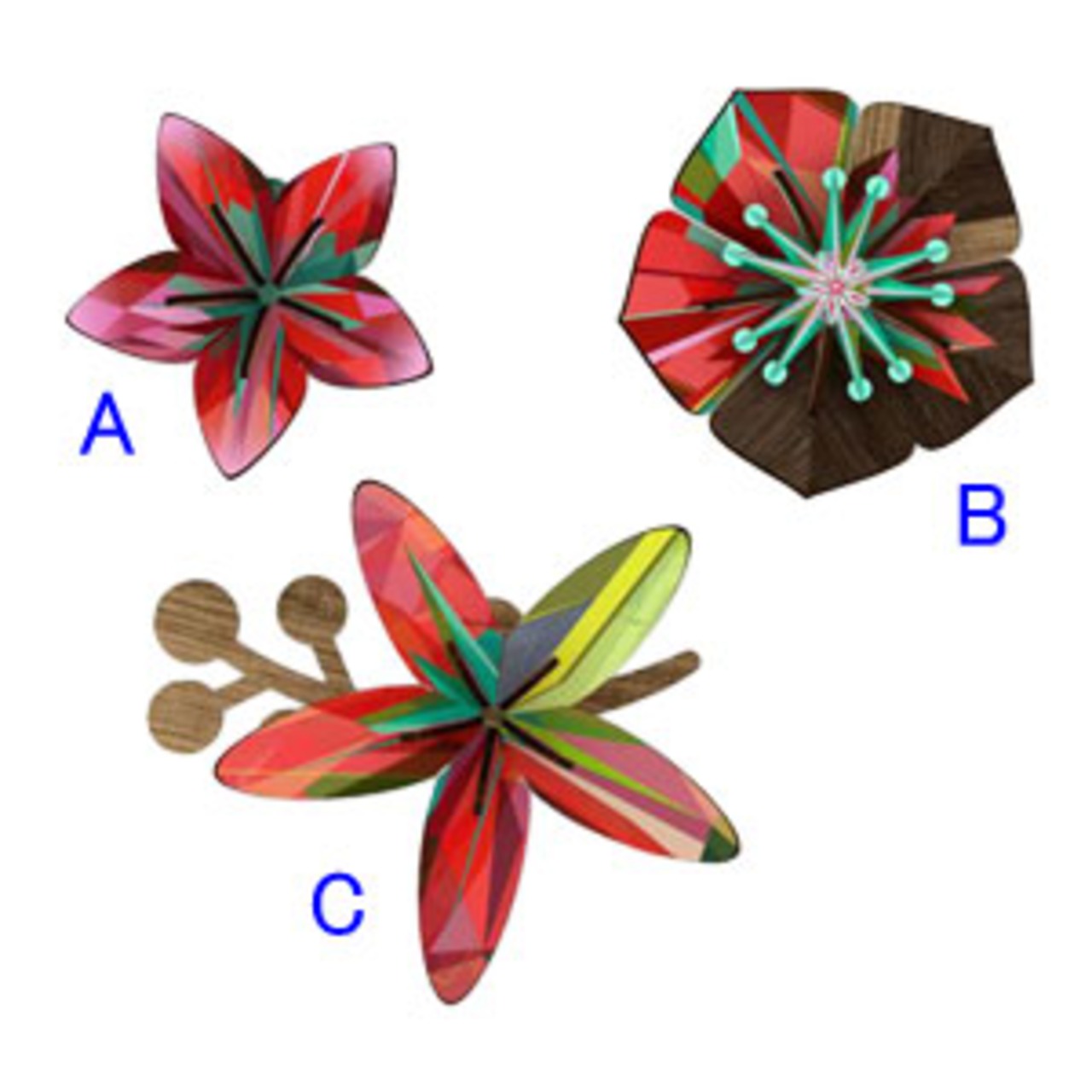 MDF板を組み立ててつくる花の壁掛けオブジェです。カラフルでポップながらも、ナチュラルさを残した素敵なデザインになっています。