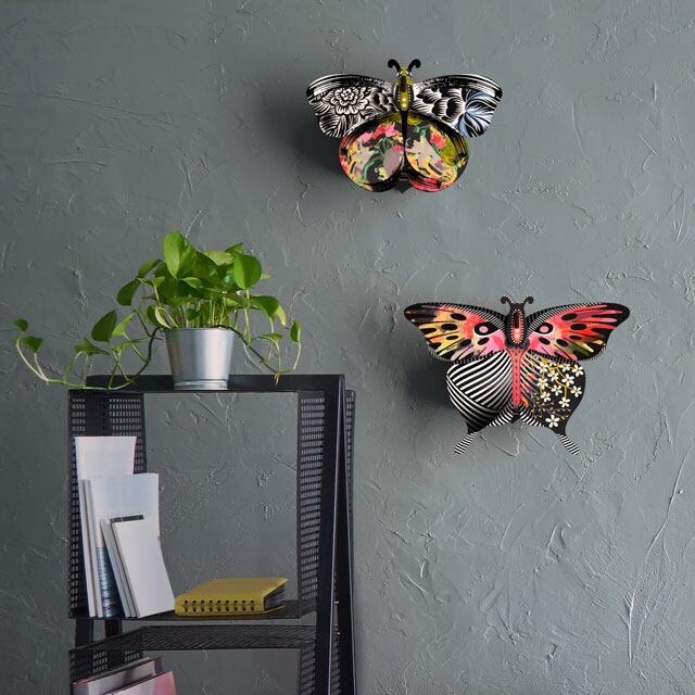 美しい蝶のデザインの壁掛けオブジェです。羽の部分が開閉できるようになっており、ウォールラックとして小物を収納できます。また、鏡としてもお使いいただけます。