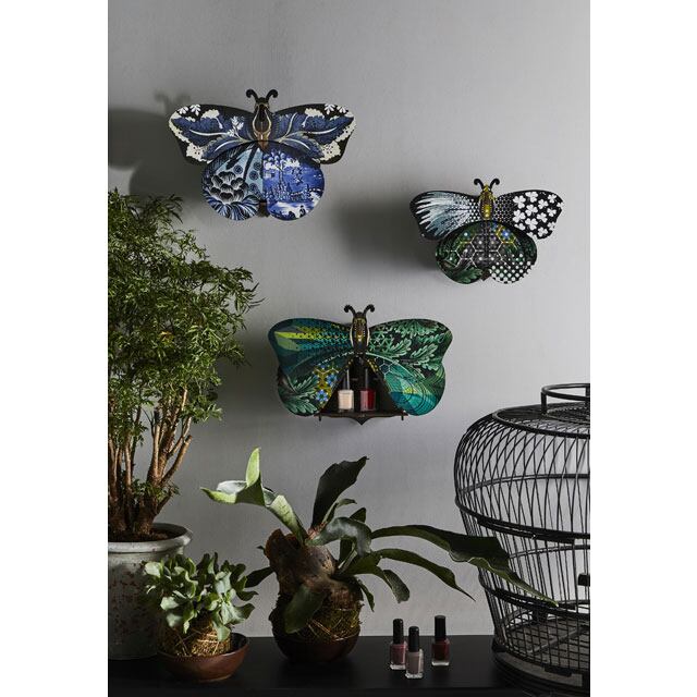 美しい蝶のデザインの壁掛けオブジェです。羽の部分が開閉できるようになっており、ウォールラックとして小物を収納できます。また、付属のフックを取り付けて、キーボックスとしてもお使いいただけます。