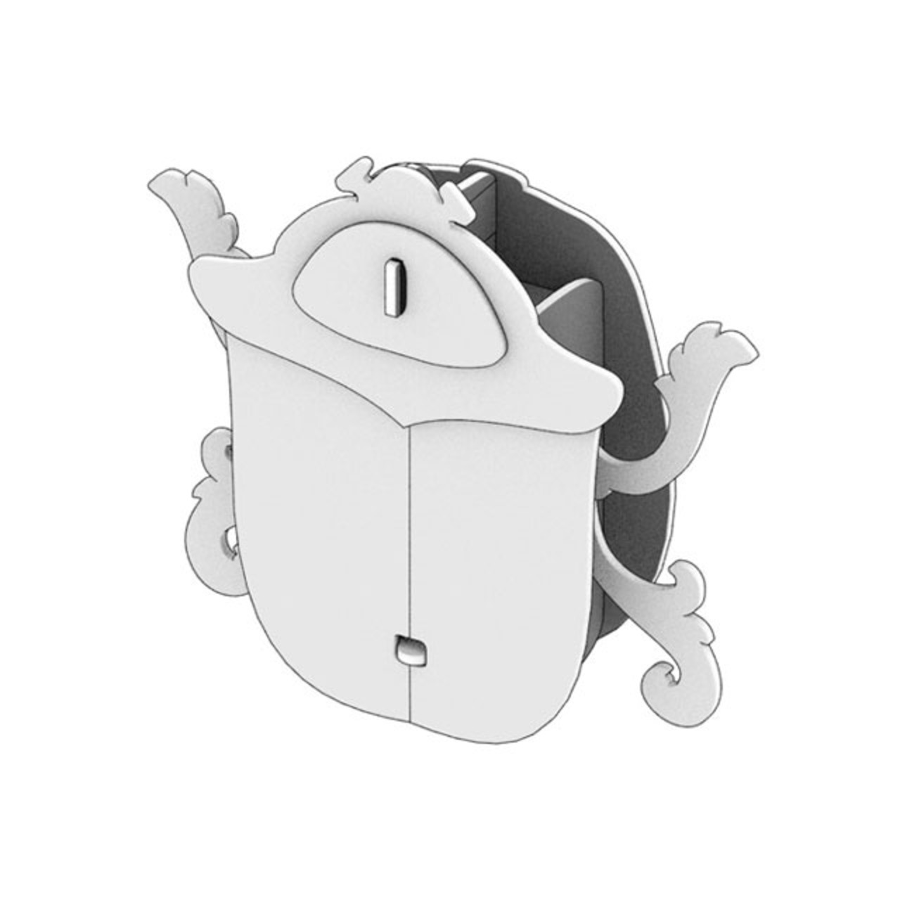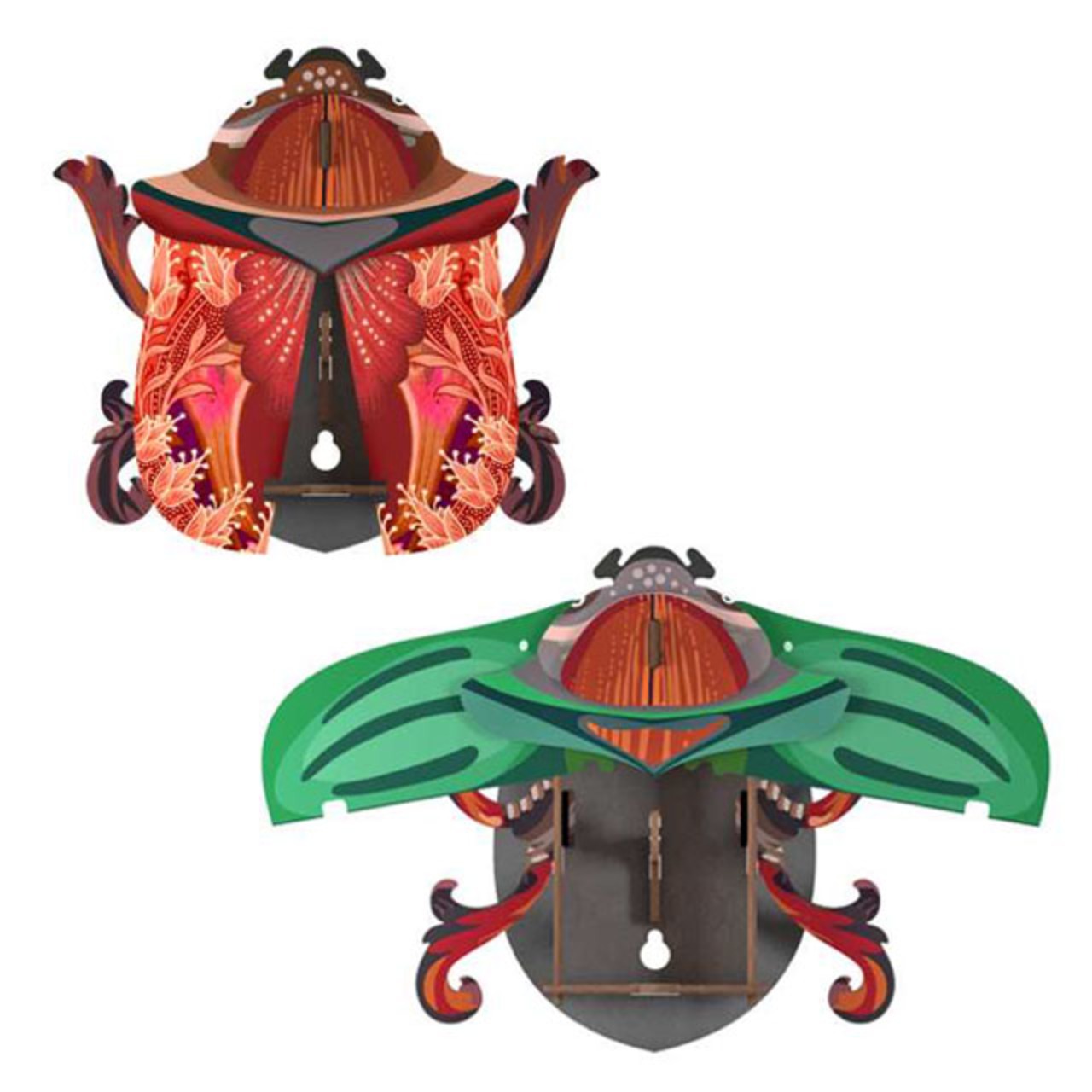昆虫をモチーフにした、MDF板を組み立ててつくる壁掛けオブジェです。羽の部分が開閉できるようになっており、キーボックスとしてもお使いいただけます(フック1個付き)。また、脚のパーツを取り付けずに、丸いコロンとしたフォルムを楽しむこともできます。