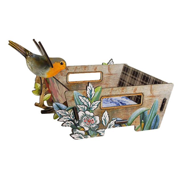 MDF製のカラフルなバスケットです。お菓子やパン、ジャムのビンなどを並べて食卓を彩るのはもちろん、文房具やコスメなどの小物入れにもぴったり。かわいい小鳥がアクセントになっています。